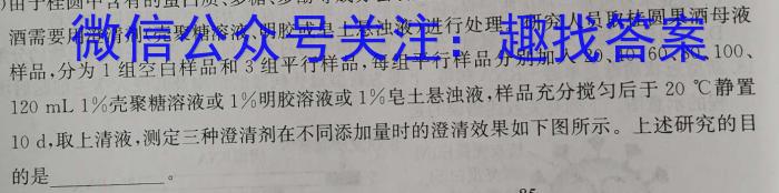 (2)由于桂圆中含有的蛋白质、多糖、多酚等成分会引起桂圆果酒浑浊,因此发酵后的桂圆果酒需要用澄清剂(壳聚糖溶液、明胶或皂土悬浊液)进行处理。研究人员取桂圆果酒母液样品,分为1组空白样品和3组平行样品,每组平行样品分别加入20、40、60、80、100、120mL1%壳聚糖溶液或1%明胶溶液或1%皂土悬浊液,样品充分搅匀后于20^C静置10d,取上清液,测定三种澄清剂在不同添加量时的澄清效果如下图所示。上述研究的目的是。