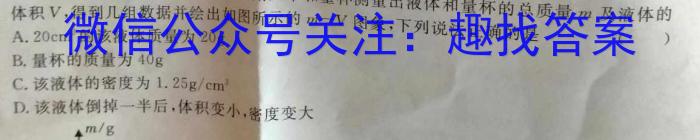 12.在测量液体密度的实验中,小明利用天平和量杯测量出液体和量杯的总质量m及液体的体积V,得到几组数据并绘出如图所示的m一V图象,下列说法正确的是()A.20cm^3的该液体质量为20gB.量杯的质量为40gC.该液体的密度为1.25g/cm1.25g/cm^3D.该液体倒掉一半后,体积变小,密度变大