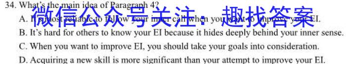 34.What’s the main idea of Paragraph 4?A.It’s most reliable to follow your inner call when you want to improve your EI.B.It’shard for others to know your EI because it hides deeply behind your inner sense.C.When you want to improve EI, you should take your goals into consideration.D.Acquiring a new skill is more significant than your attempt to improve your EI.