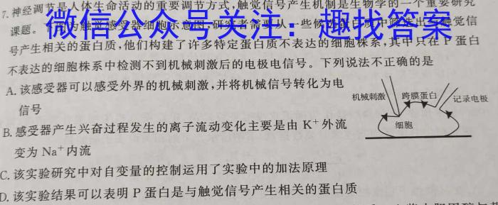 7.神经调节是人体生命活动的重要调节方式,触觉信号产生机制是生物学的一个重要研究课题。下图为触觉感受器细胞示意图,研究者需要从一些候选蛋白质中筛选出与触觉信号产生相关的蛋白质,他们构建了许多特定蛋白质不表达的细胞株系,其中只在P蛋白不表达的细胞株系中检测不到机械刺激后的电极电信号。下列说法不正确的是A.该感受器可以感受外界的机械刺激,并将机械信号转化为电信号B.感受器产生兴奋过程发生的离子流动变化主要是由K^+外流变为Na^+内流C.该实验研究中对自变量的控制运用了实验中的加法原理D.该实验结果可以表明P蛋白是与触觉信号产生相关的蛋白质