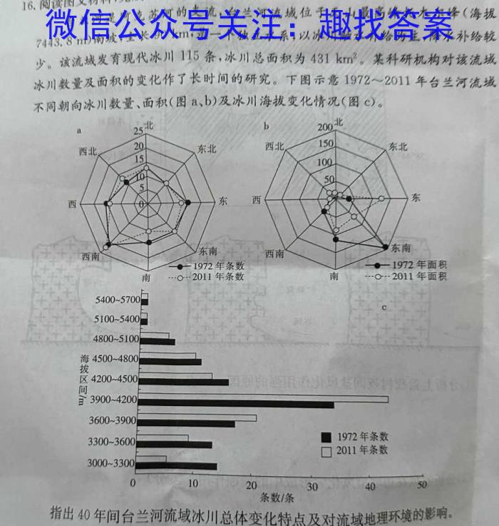 台兰河是阿克苏河的支流,台兰河流域位于天山最高峰托木尔峰(海拔7443.8m)南坡,全长90km,是一个独立水系,以冰川融水补给为主,降水补给较少。该流域发育现代冰川115条,冰川总面积为431km²。某科研机构对该流域431km^2。冰川数量及面积的变化作了长时间的研究。下图示意1972~2011年台兰河流域1972∼2011不同朝向冰川数量、面积(图a、b)及冰川海拔变化情况(图条数/条指出40年间台兰河流域冰川总体变化特点及对流域地理环境的影响,