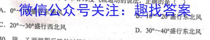 29.下列关于甲图所示季节各纬度气流运动的说法,正确的是()A.0^10^盛行东南风B.10^20^盛行东北风C.20^30^盛行西北风D.30^40^盛行东北风
