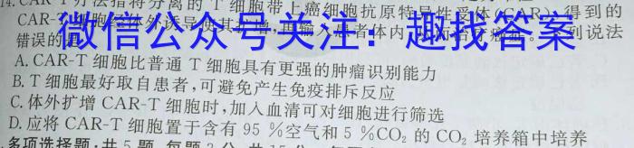 14.CAR-T14.CAR-T疗法指将分离的T细胞带上癌细胞抗原特异性受体(CAR),得到的(CAR),CAR-T细胞经体外诱导使其扩增,再输入患者体内,从而治疗癌症。下列说法错误的是A.CAR-T细胞比普通T细胞具有更强的肿瘤识别能力B.T细胞最好取自患者,可避免产生免疫排斥反应C.体外扩增CAR-T细胞时,加入血清可对细胞进行筛选D.应将CAR-T细胞置于含有95%空气和5\%CO2的CO2培养箱中培养
