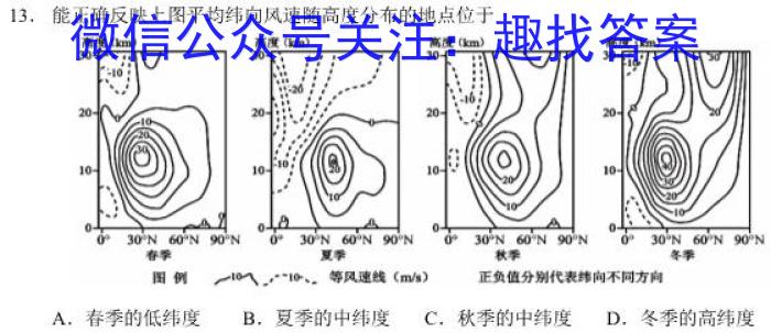 13.能正确反映上图平均纬向风速随高度分布的地点位于图例八.10、.等风速线(m/s)正负值分别代表纬向不同方向A.春季的低纬度B.夏季的中纬度C.秋季的中纬度D.冬季的高纬度