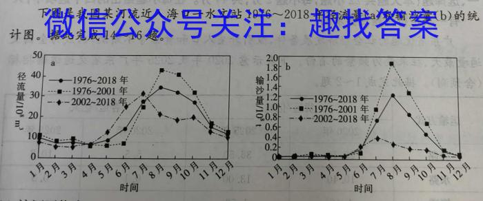 下图是我国某河流近入海口一水文站1976~2018年径流量(a)和输沙量(b)的统计图。据此完成14~16题。50a1.8b径40-1976~2018年输1.6-1976~2001年沙1.430-2002~2018年量-1976~2018年2000.8一1976~2001年◆-2002~2018年0.6100.40.20时间时间