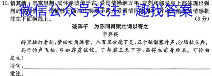 10.悟其情·丰富思想:满怀赤诚传千古,爱国情操继万年,曹刿和邹忌身上都体现出强烈的爱国情怀。请摘抄下面诗中表现了词人爱国情怀的词句,并将其蕴含的情感批注在下面横线上。(3分)破阵子为陈同甫赋壮词以寄之辛弃疾醉里挑灯看剑,梦回吹角连营。八百里分麾下炙,五十弦翻塞外声,沙场秋点兵。马作的卢飞快,弓如霹雳弦惊。了却君王天下事,赢得生前身后名。可怜白发生!诗句:批注: