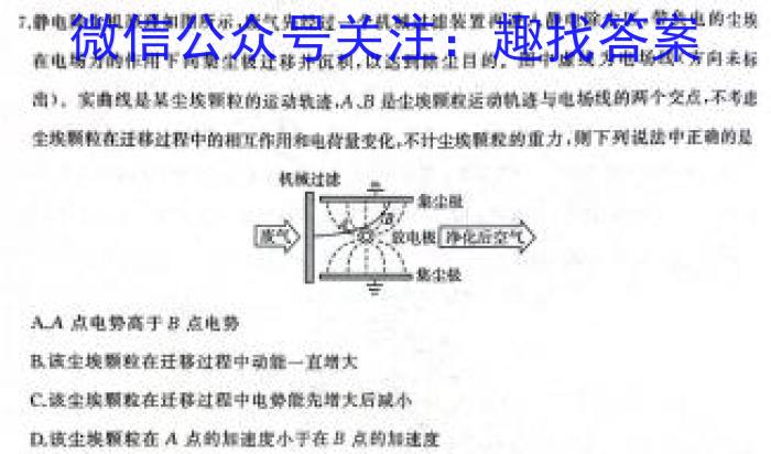 7.静电除尘机原理如图所示,度气先经过一个机械过滤装置再进入静电除尘区,带负电的尘埃在电场力的作用下向集尘极迁移井沉积,以站到除尘目的,图中虚线为电场线(方向未标出),实曲线是某尘埃颗粒的运动轨迹,A、B是尘埃颗粒运动轨连与电场线的两个交点,不考虑尘埃颗粒在迁移过程中的相互作用和电荷量变化,不计尘埃颗粒的重力,则下列说法中正确的是A.A点电势高于B点电势B.该尘埃颗粒在迁移过程中动能一直增大C.该尘埃颗粒在迁移过程中电势能先增大后减小D.该尘埃颗粒在A点的却速度小于在B点的加速度