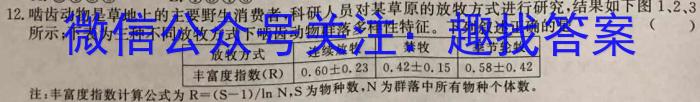 12.啮齿动物是草地上的主要野生消费者,科研人员对某草原的放牧方式进行研究,结果如下图1、2、3所示;下表为三种不同放牧方式下啮齿动物群落多样性特征。下列叙述正确的是()注:丰富度指数计算公式为R=(S-1)/1nN,S为物种数,N为群落中所有物种个体数。R=(S-1)/minN,S