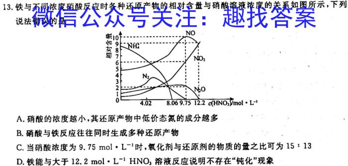 13.铁与不同浓度硝酸反应时各种还原产物的相对含量与硝酸溶液浓度的关系如图所示,下列说法错误的是c(HNO/mol·L^-1A.硝酸的浓度越小,其还原产物中低价态氮的成分越多B.硝酸与铁反应往往同时生成多种还原产物C.当硝酸浓度为9.75molL^-1时,氧化剂与还原剂的物质的量之比可为15:13D.铁能与大于12.2molL^-1HNO,溶液反应说明不存在“钝化”现象