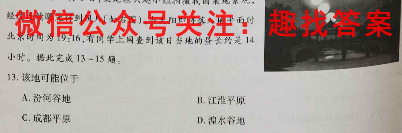 经过连续曝光得到照片(如右图),当太阳即将落入地平面时北京时间为19:16,有同学上网查到该日当地的昼长约是14小时。据此完成13~15题。13.该地可能位于A.汾河谷地B.江淮平原C.成都平原D.涅水谷地