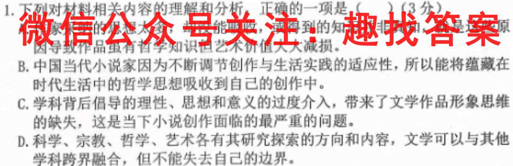 1.下列对材料相关内容的理解和分析,正确的一项是()(3分)A.作家采纳的思想太多,却没能吸收,或得到的知识并非真知,就是这些原因导致作品虽有哲学知识但艺术价值大大减损。B.中国当代小说家因为不断调节创作与生活实践的适应性,所以能将蕴藏在时代生活中的哲学思想吸收到自己的创作中。C.学科背后倡导的理性、思想和意义的过度介入,带来了文学作品形象思维的缺失,这是当下小说创作面临的最严重的问题。D.科学、宗教、哲学、艺术各有其研究探索的方向和内容,文学可以与其他学科跨界融合,但不能失去自己的边界。