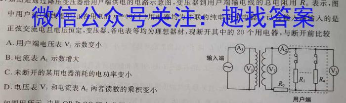 5.如图是通过降压变压器给用户端供电的电路示意图,变压器到用户端输电线的总电阻用R0,表示,图中用户端(虚线框中)正在用电的n=60(个)用电器均为并联的纯电阻用电器。已知输入端输人的是正弦交流电且电压恒定,变压器、各电表等均为理想器材,现断开其中的20个用电器,与断开前比较A.用户端电压表V3示数变小B.电流表A1示数增大C.未断开的某用电器消耗的电功率变小D.电压表V2和电流表A2两者读数的乘积变小
