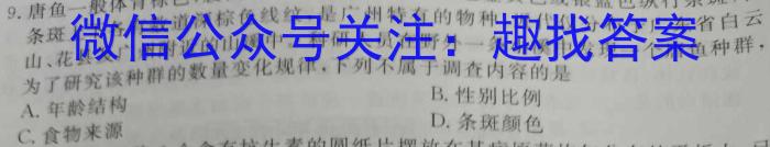 9.唐鱼一般体背棕色,腹面银白,沿体侧中部有1道金黄色或银蓝色纵行条斑,在条斑上下各有数道深棕色线纹,是广州特有的物种,近代仅分布于广东省自云山、花县及广州附近的山溪中。科研人员在野外一条小溪中发现一个唐鱼种群,为了研究该种群的数量变化规律,下列不属于调查内容的是B.性别比例A.年龄结构C.食物来源D.条斑颜色