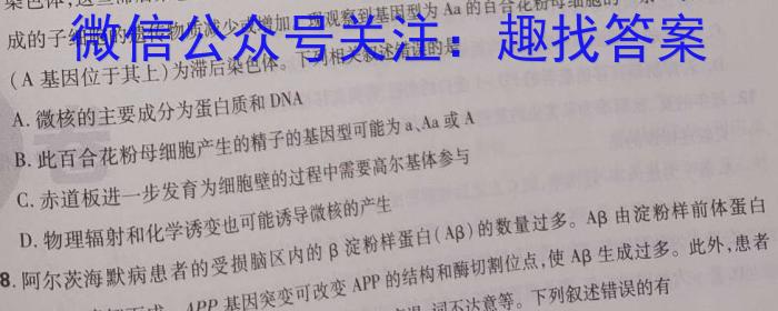 7.减数分裂I后期,当大部分染色体已移向细胞的两极时,有的染色体还滞留于赤道板上,成为滞后染色体,这些滞后染色体会随机分布或丢失或游离于主核之外形成微核,从而导致减数分裂后形成的子细胞的遗传物质减少或增加。现观察到基因型为Aa的百合花粉母细胞的一条7号染色体(A基因位于其上)为滞后染色体。下列相关叙述错误的是A.微核的主要成分为蛋白质和DNAa、AaB.此百合花粉母细胞产生的精子的基因型可能为a、Aa或AC.赤道板进一步发育为细胞壁的过程中需要高尔基体参与D.物理辐射和化学诱变也可能诱导微核的产生