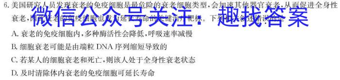 6.美国研究人员发现衰老的免疫细胞是最危险的衰老细胞类型,会加速其他器官衰老,从而促进全身性衰老,因此衰老的免疫细胞也成为延长寿命的关键治疗靶标。下列相关叙述错误的是A.衰老的免疫细胞内,多种酶活性会降低,呼吸速率减慢B.细胞衰老可能是由端粒DNA序列缩短导致的C.若某人的细胞衰老和死亡,则该人处于全身性衰老状态D.及时清除体内衰老的免疫细胞可延长寿命