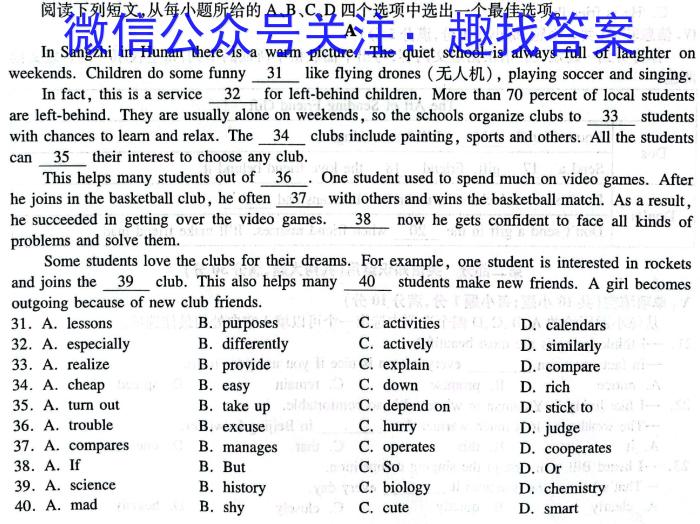 湘教考苑 2023年高考模拟试卷(试题卷五)英语试题试卷答案,我们目前收集并整理关于湘教考苑 2023年高考模拟试卷(试题卷五)英语试题得系列试题及其答案,更多试题答案请关注微信公众号:趣找答案/直接访问www.qzda.com(趣找答案) 湘教考苑 2023年高考模拟试卷(试题...